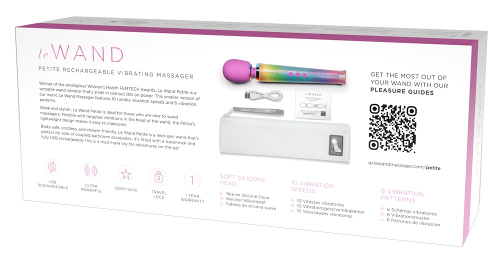 The luxury massage wand, Petite Rechargeable Vibrating Massager All That Glimmers from le WAND, is perfect for intense solo and couple's massages. Wild, colourful and creative – the special edition is in glittering rainbow colours! The 6 vibration modes in 10 intensities ensure individual and versatile massage pleasure and can be easily controlled using the 3 buttons on the handle. The massage wand can even be used in the bath or the shower because it is waterproof. It also features a practical travel lock for discreet transport and storage.