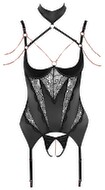 Sensational basque from Abierta Fina made out of stretchy satin that has lace inserts that go down the basque and rose-gold coloured decoration. The integrated underwired shelf bra with slightly padded cups emphasise the beautiful breasts and make them the centre of attention. The two adjustable cleavage straps are fancy because they go from the adjustable bra straps to the choker. The choker has a hook and loop fastener. The chains over the breasts and shoulders are decorated with rhinestones and have snap hooks which means that they are removable. The small crotchless string made out of stretchy satin and a removable chain over the crotch is included.