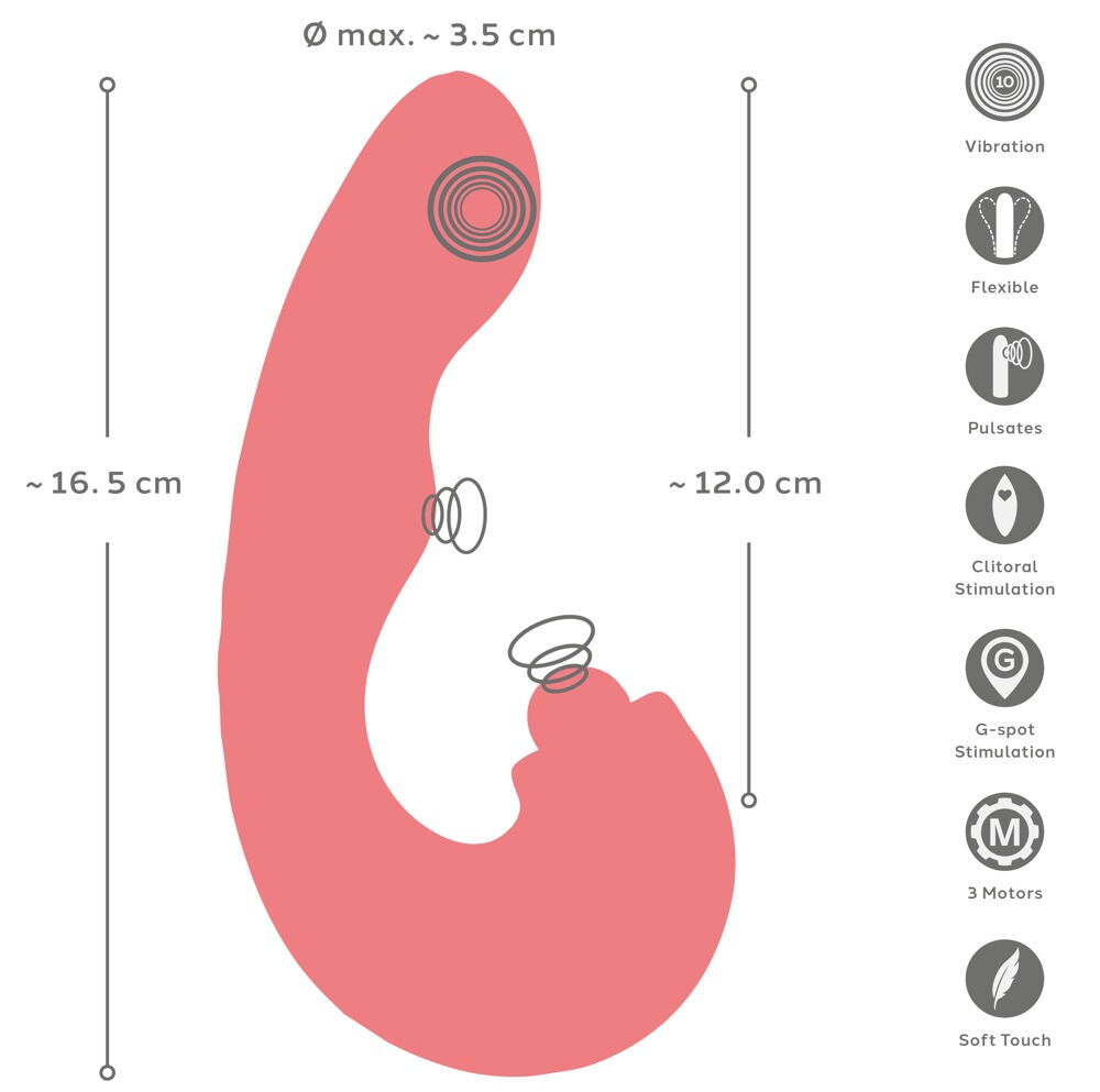 The 3 quiet but powerful motors provide reliable stimulation during the all-round pleasure. The vibrations in the head are in 10 modes. The knocking impulses in the slightly textured shaft are for the G-spot and have 5 modes. The soft, knocking and pulsating clit ball has 3 modes. The functions can be controlled separately and therefore combined with each other to suit every desire and need!