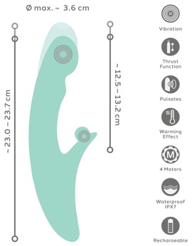 The 4 quiet but strong motors reliably supply the Metallic Vibrator with power and pleasant warmth (up to 44°C). The various functions can be easily controlled at the push of a button – separately or in exciting combination. The thrusting power over 0.7 cm in 9 speeds, the pulsating vibro-head in 5 modes and the vibrations in 10 modes offer plenty of variety. The be Warming vibrator can even be used in the bath or the shower because it is waterproof!