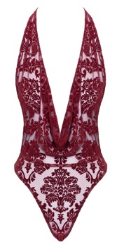 The emphasising thong body Kink Royal from Noir is in a breathtaking transparent burgundy red colour and is decorated with velvet flock print. It is soft and stretchy for a very comfortable fit and freedom of movement. It also has a very low-cut cowl neckline. It has a halterneck as well – the shoulders and back remain excitingly bare.
