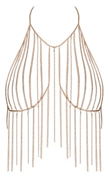 The gold-coloured Chain Top from Cottelli ACCESSOIRES is partially covered in rhinestone decoration. The elegant gem has a snap hook at the back of the neck and at the back for adjusting the top. The rest of the back is bare. It can be worn on the naked body for a stylish and erotic look. The shiny chain look can also be worn with stylish swimwear or tight-fitting outfits too.