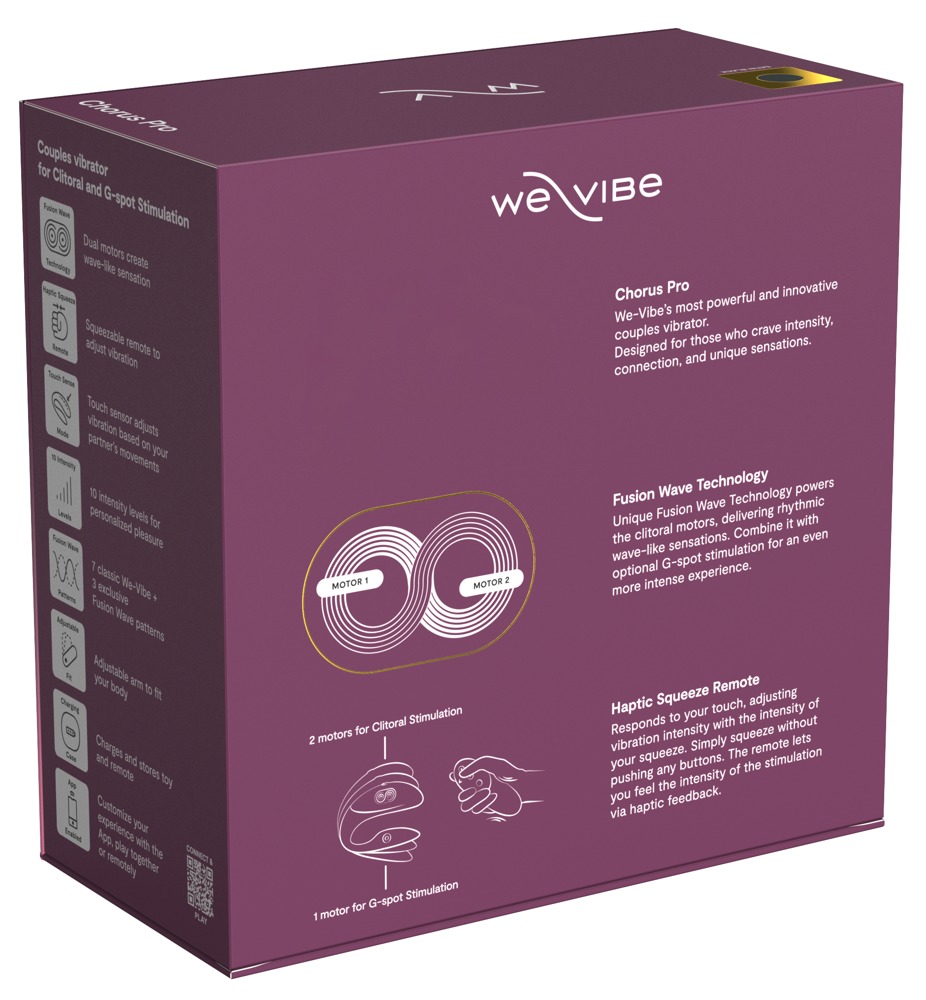 The Chorus Pro couple's vibrator from We-Vibe has 3 motors and pleasures both partners with intense vibrations during sex. Thanks to its innovative Fusion Wave technology – a unique combination of more power and deeper, more diverse stimulation – both partners can experience particularly intense and varied sensations without any numbness. The Fusion Wave technology ensures rhythmic, wave-like movements of the two clitoral motors – delivering deep, versatile stimulation that only We-Vibe can offer.