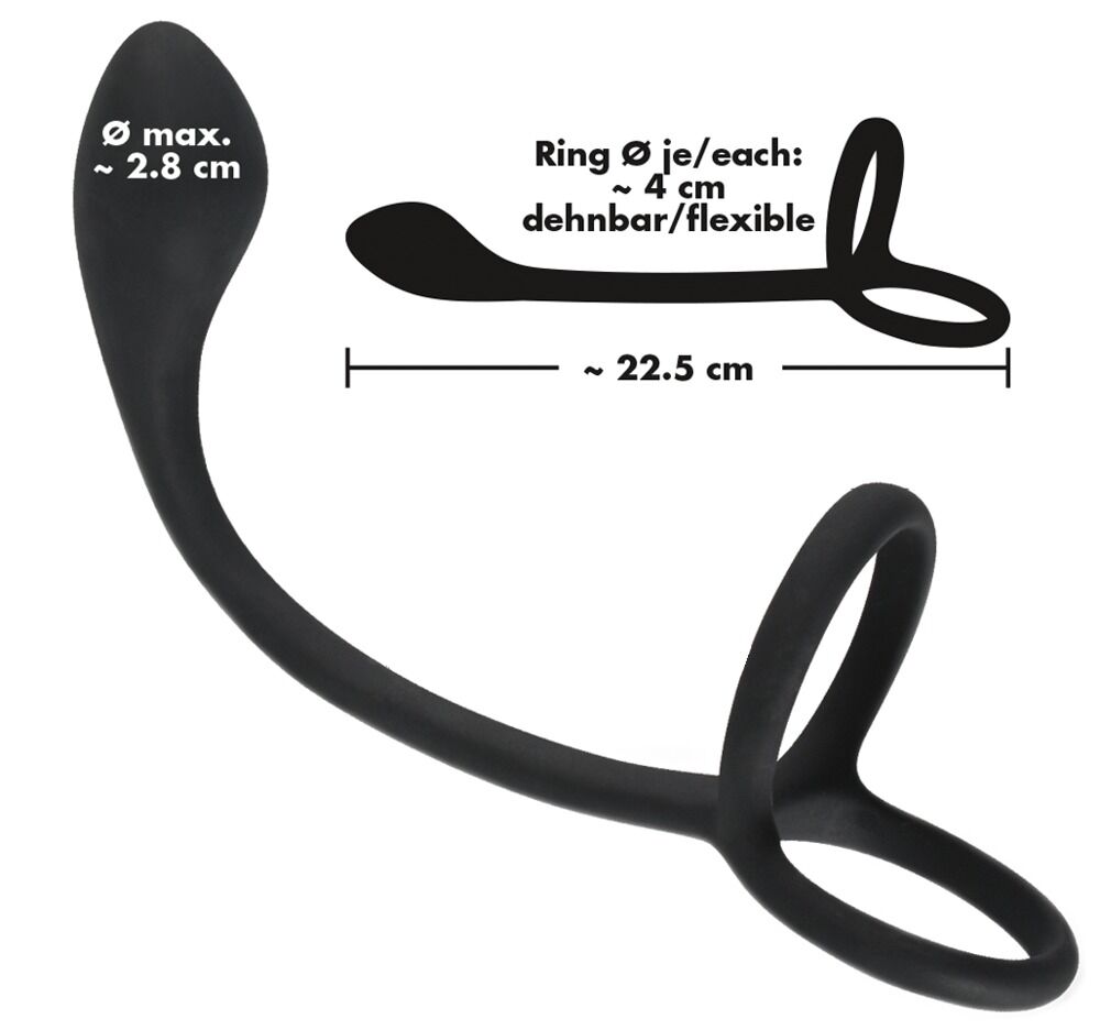 Enjoy triple stimulation with this black butt plug from "Black Velvets" – it won't just be the back door that gets stimulation, the front will too! The integrated rings go over the penis and testicles, and create the blood flow restriction effect that makes the erection even harder, more powerful and above all longer-lasting. The butt plug itself has a large head for spot-on prostate stimulation (also known as the P-spot which is a man's pleasure spot). The butt plug's narrow shaft goes seamlessly into the cock and testicle rings and provides simultaneous perineum stimulation.