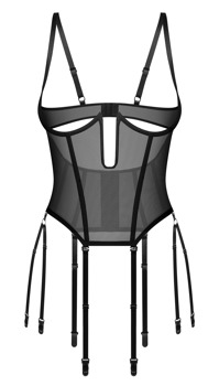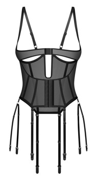 The open cup corset Euphori from Obsessive is extremely seductive because it is in a minimalistic style and made out of exciting transparent material, The delicate black powernet clings sexily but gently to the skin. The underwired cups support the uncovered breasts to create a beautiful shape. The shaping wires create a sexy silhouette and they emphasise the waist as well. The bra straps and the 2 hook fasteners at the back can be adjusted to fit. The 8 suspender straps are also adjustable and they can be removed as well.