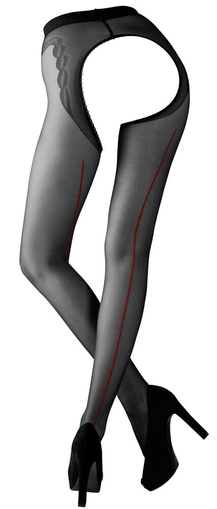 Crotchless tights with reinforced toes and panty part. Red decorative seam down the legs. Black. 79% polyamide, 20% spandex. 1% polypropylene. show more