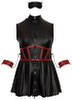 Sleeveless, short dress from Cottelli BONDAGE PLUS in a tight cut with a flared skirt. The dress is completely stretchy and has an elegant black matte look with red contrasting stripes in a waist-accentuating bodice look. Each side has a ring for the two included soft arm cuffs with their snap hook chains. The cuffs are adjustable with hook-and-loop fasteners. Front with full-length 2-way zip that can be opened from the stand-up collar and the seam. A lightly padded eye mask is also included and fully opaque for exciting play.