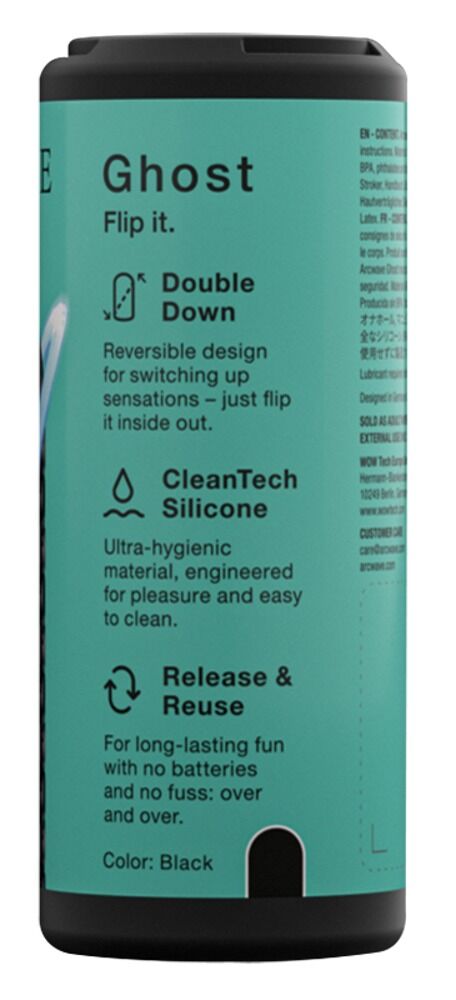 Handy masturbator sleeve Ghost by Arcwave for sensual handjobs and enhanced climaxes. Made entirely of soft silky CleanTech silicone - the pressure and intensity of the handjob can be individually adjusted. Enjoy the penis massage with gentle dots or pronounced grooves by simply reversing the highly stretchable sleeve. The lightweight, yet very robust Ghost is also easy to include in lovemaking with a partner. And it fits in any pocket - perfect for on the go pleasure.