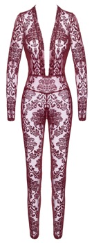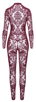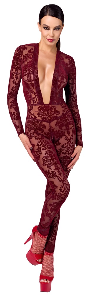 The long-sleeved, skin-tight jumpsuit Kink Royal from Noir is in a breathtaking burgundy red colour. It is also decorated with velvet flock print as well. It is soft and stretchy for a very comfortable fit and freedom of movement. It is very low cut in the cleavage area and there is also a discreet zip over the crotch.