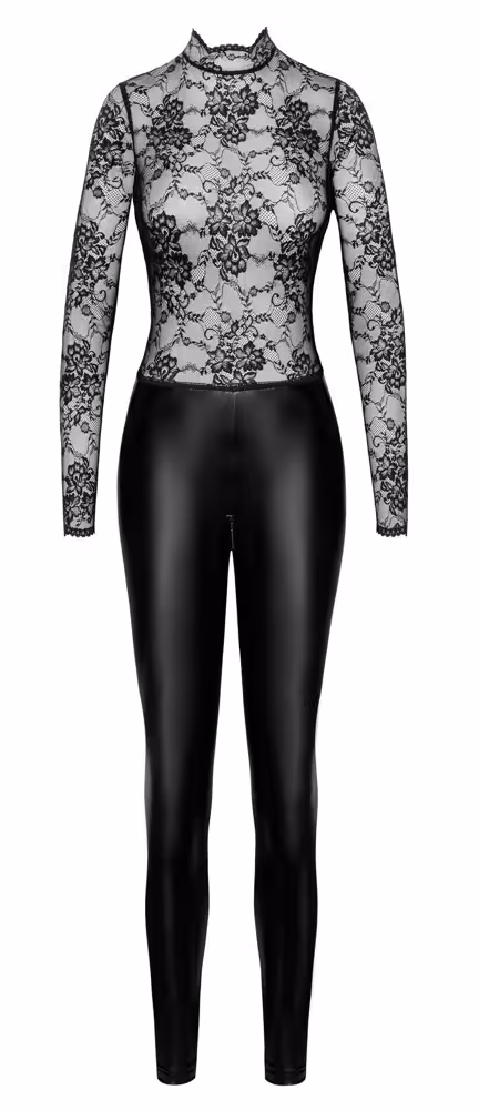 The tight-fitting, black jumpsuit Orgia Exclusive from Noir has long sleeves. The jumpsuit is made out of beautiful lace (top part) and powerwetlook. The jumpsuit fits like a second skin. It is also soft and stretchy for a very comfortable fit. There is a cut-out at the back. It has a stand-up collar with a button fastener. With a zip over the crotch, which is both practical and seductive at the same time