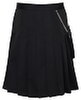 Black knee-length kilt by Svenjoyment with a detachable pocket. The kilt's firm woven fabric is tight at the top and then pops open in numerous pleats. Waistband with press stud fastening and underlaid zip. The flap pocket is removable with its snap hook chains.