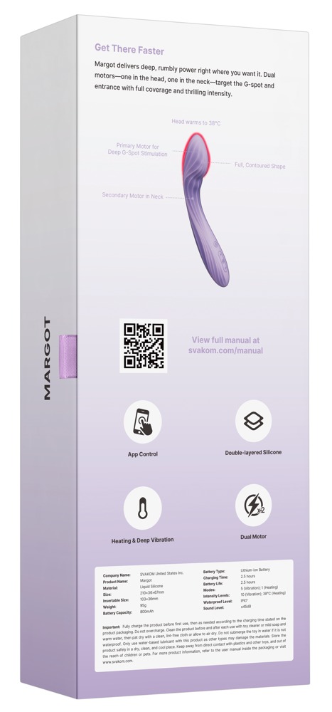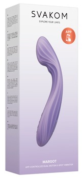 The App-controlled Dual Motor G-spot Vibrator Margot from SVAKOM is ergonomically curved with a flattened head for targeted pleasure spot stimulation inside and outside of the body. The G-spot and clitoris, in particular, will enjoy an intense massage! Gentle wave textures further intensify the sensations. Soft and silky, The Dual Layer silicone vibrator is soft and silky, which means that it can glide effortlessly over the skin and into intimate depths. It can provide pleasure with its enormous variety of vibrations. The vibrations can be controlled at the push of a button. This stylish lightweight vibrator can be comfortably incorporated into any solo or couple's play. Margot can even be used in the bath or shower because it is waterproof.