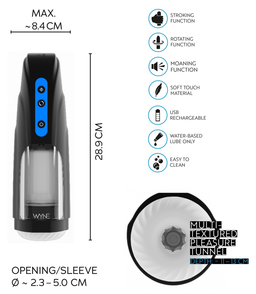 The powerful masturbator 09 from WYNE, pleasures the entire penis with its exciting rotating sleeve that moves up and down. Sexy, whispered moans via the included headphones provide atmospheric background sounds. Just lean back and enjoy!