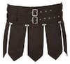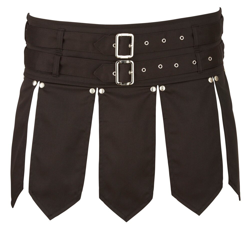 Black gladiator-style skirt with two belts. It is stretchy at the back. 60% polyester, 35% cotton, 5% spandex. show more