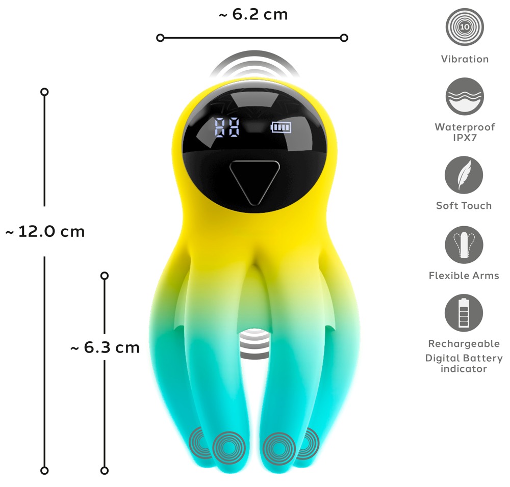 The vibrating Multi-Toy be Squidly from be Sassy is in a cheeky, seductive squid design and has 6 soft, movable vibro-arms. It is made out of velvety soft silicone and can therefore adapt perfectly and flexibly to the body and play. The very powerful vibrations spread from the head to each individual tentacle – perfect for gently caressing and pleasuring external pleasure spots such as the clitoris, nipples and more. The cheeky multi-vibrator also fits perfectly in the palm of a hand for a stimulating penis and testicle massage. The soft dots on the inside provide even more intense pleasure. A versatile fun toy for unlimited play – alone or with a partner.