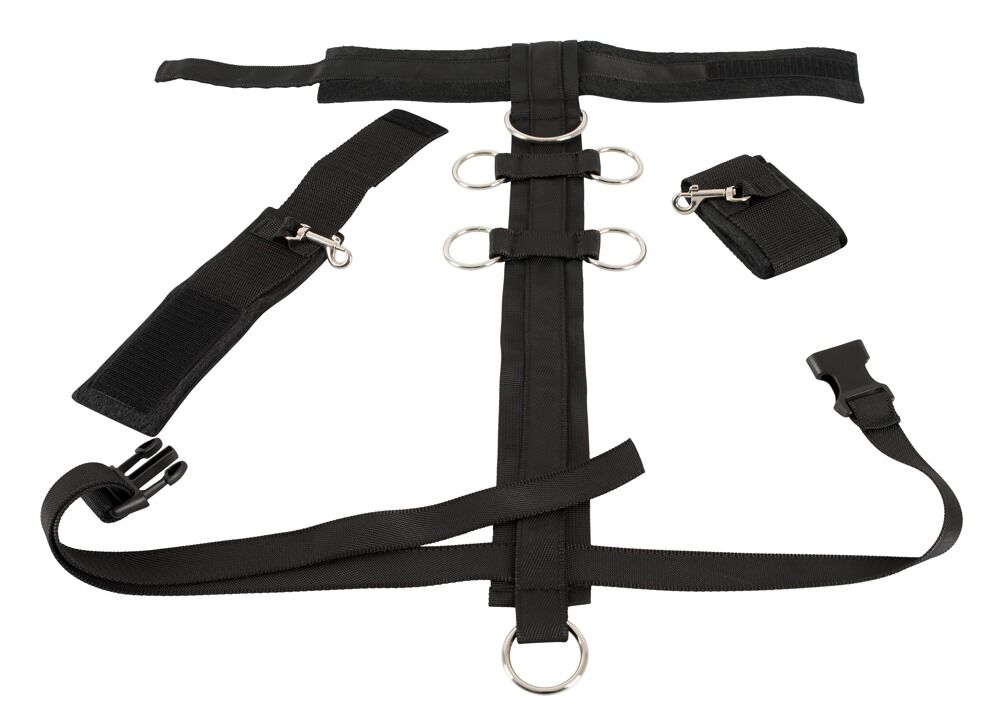 This torso restraint is perfect for diverse bondage fun. The neck strap is padded. The neck and waist strap are adjustable. The padded handcuffs have snap hooks and can therefore be attached to the rings in the chest, neck and waist area. This means that the wearer can be tied up in various ways, while still being very comfortable.