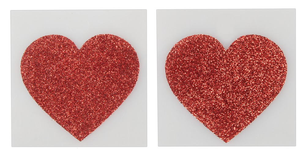 Sparkly, red, heart shaped nipple stickers. There are adhesive strips at the back.