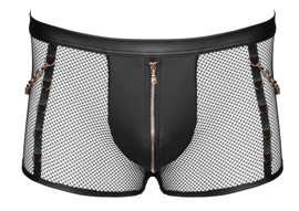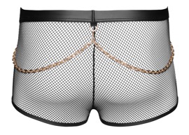 The emphasising black pants from Svenjoyment are made out of revealing net material that's combined with trendy wetlook materal. With a zip on the opaque pouch. They are soft and stretchy for a very comfortable fit. Furthermore, there are decorative gold-coloured rings at either side and at the back (on the waistband). The two gold-coloured snap hook chains can be removed.