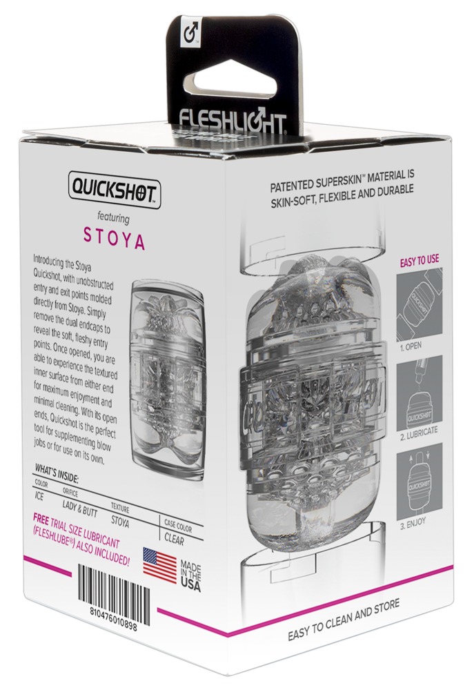 The small, easy-to-use masturbator Quickshot Stoya from Fleshlight is in a transparent, easy-to-hold case with a protective lid. Both ends can be used during a handjob: one side is in a vagina shape and one side is in an anus shape. Both ends are realistic replicas of the erotic star Stoya's intimate areas! The pleasure tunnel is made out of skin-like Super Skin material and there are various pronounced stimulating textures inside as well – all this means that the experience with Stoya feels extremely realistic. Stoya has even put her autograph on the packaging!