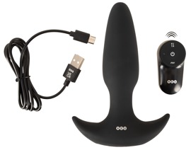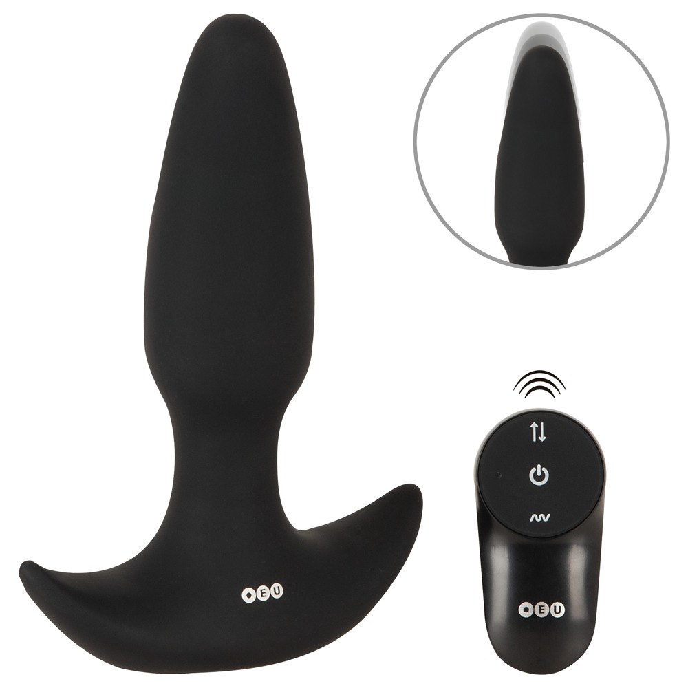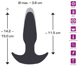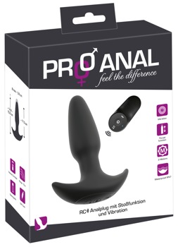 The RC Butt Plug with a Thrust Function and Vibration from Pro Anal has 2 motors and is in a cone shape with a gentle tip. The silicone plug fits safely and securely inside the anus, thanks to its wide, anchor-safe base. Once the plug is in place, it can provide deep vibrating pleasure with intense thrusts (over 0.8 cm in length). The 7 vibration modes and 3 thrusting speeds can be easily controlled via the practical remote control. The remote has a range of up to 10 metres, which means that it can also be used by a partner! Both of the functions can also be controlled separately on the plug as well. The thrusting vibro-butt plug can even be used in the bath or the shower because it is waterproof. The plug is made out of velvety soft silicone, meaning that it can be easily inserted and it can also adapt perfectly to the body and its movements too. Extremely comfortable – even when it's being worn over a longer period of time.