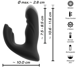 The 2 quiet motors provide reliable power for all-round anal stimulation. The 7 vibration modes and 3 thrusting speeds offer versatile fun. Both of the functions can be controlled separately via the practical remote control. The remote has a range of 10 metres, meaning that it can also be controlled by a partner. Thrusts and vibrations can also be easily controlled directly on the toy. The RC Mini Prostate Plug can even be used in the bath or the shower because it is waterproof.
