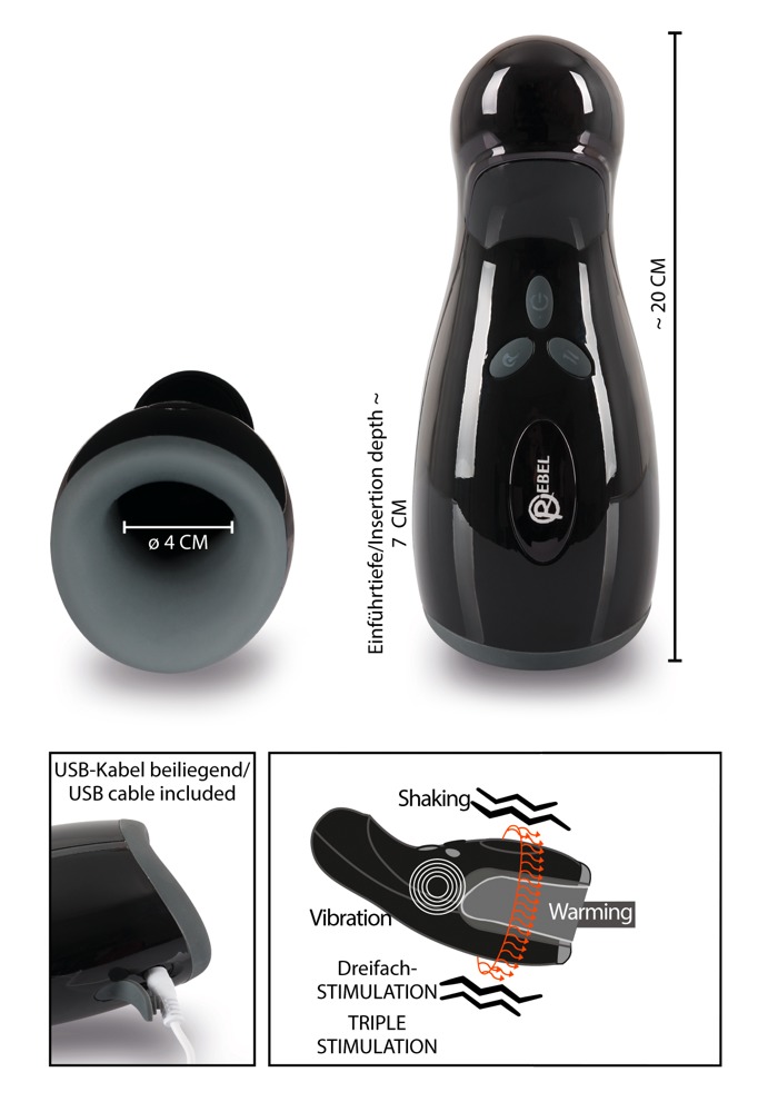 Masturbator with 3 functions. The masturbator has vibration, a warming function and an up-and-down movement. The functions can be controlled separately with the 3 buttons. Vibrations in 7 modes, up-and-down movement in 7 speeds, warming function approx. 40 °C. The sleeve is securely integrated into the masturbator and cannot be removed. It can be recharged with the included USB cable. Black. Complete length 20 cm, insertion depth 7 cm, Ø 4 cm. Silicone with a PU coating, ABS.