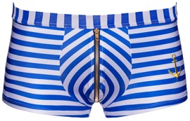 Tight, emphasising pants from Svenjoyment with maritime blue and white stripes. 2 white cuffs are included. There is a zip over the pouch and embroidery in an authentic anchor shape. They are soft and stretchy for a very comfortable fit. The cuffs have decorative press studs on them.