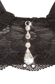 3-piece suspender set made out of delicate black lace. The underwired bra with beautiful rhinestones at the front looks extremely sexy and is wonderful decoration for the otherwise naked breasts. It also has a rhinestone ring over each nipple that is attached to straps (adjustable). The suspender belt´s sparkly rhinestone fastener at the front makes it look very seductive and the string is invitingly open in the crotch area! The bra and suspender belt have a hook fastener at the back. The bra straps, suspender straps and cup straps are adjustable.