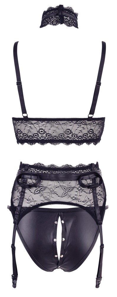 Beautiful bralette with removable cups (can be unbuttoned), adjustable straps in the cleavage area and a choker. The matching suspender belt has an eye-catching design with a strap that has a decorative ring at the front. It also offers adjustable suspender straps and removable handcuffs with hook and loop fasteners at the back. Briefs with press studs that go over the crotch and stop at the top of the buttocks. Made out of floral lace in combination with trendy matte look and studs.