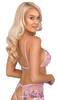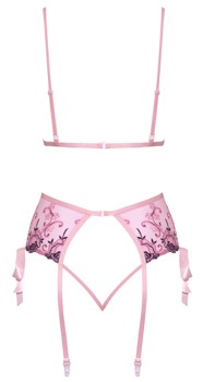 The wireless bra, suspender belt & string in a set from kissable is made entirely out of delicate light pink powernet with elaborate floral embroidery. It is soft and stretchy which means that it is very comfortable to wear. There is a playful satin bow at the front of the wireless bra and at each side of the string. The bra has a clip fastener at the back and the straps are adjustable. The suspender belt has a hook fastener at the back and adjustable suspender straps. The small string is extremely seductive because of its two narrow stretchy straps that meet in the crotch area.