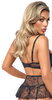 A lace ensemble with very special details! A shelf bra, suspender skirt and crotchless string from Abierta Fina in a set. All three pieces are made out of soft, delicate, stretchy black lace with rose gold-coloured accessories. The shelf bra has a decorative heart between the slightly padded, underwired cups. The chains in the cleavage area can be removed. The hook fastener at the back and the bra straps can be adjusted to fit. The figure-flattering suspender skirt has a hook fastener at the front that is decorated with sparkly stones. The adjustable suspender straps can also be removed. The string has a seductive open crotch area and a stimulating crotch chain. The crotch chain can be removed.