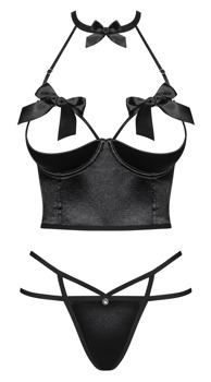 Slightly padded, underwired shelf bra and string in a set. The straps with decorative bows frame the top of the breasts. The adjustable bra straps lead to the chocker with a bow and clip fastener. The bra straps can be adjusted at the front and the back. The long shelf bra has decorative lacing at the back. The string with stretchy straps has a decorative gem above the small triangle of material.