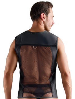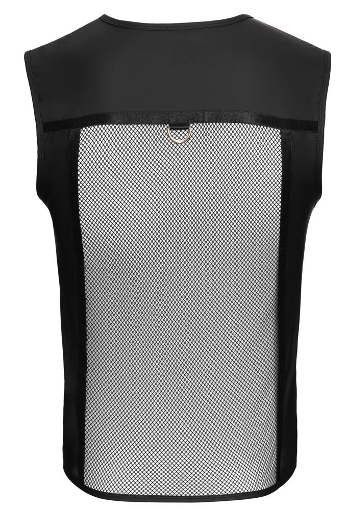 The sleeveless black shirt from Svenjoyment is made out of revealing net and trendy wetlook. It is soft and stretchy for a very emphasising but comfortable fit. There is a short, gold-coloured zip at the front. There are also decorative gold-coloured rings down the front and one at the top of the back.