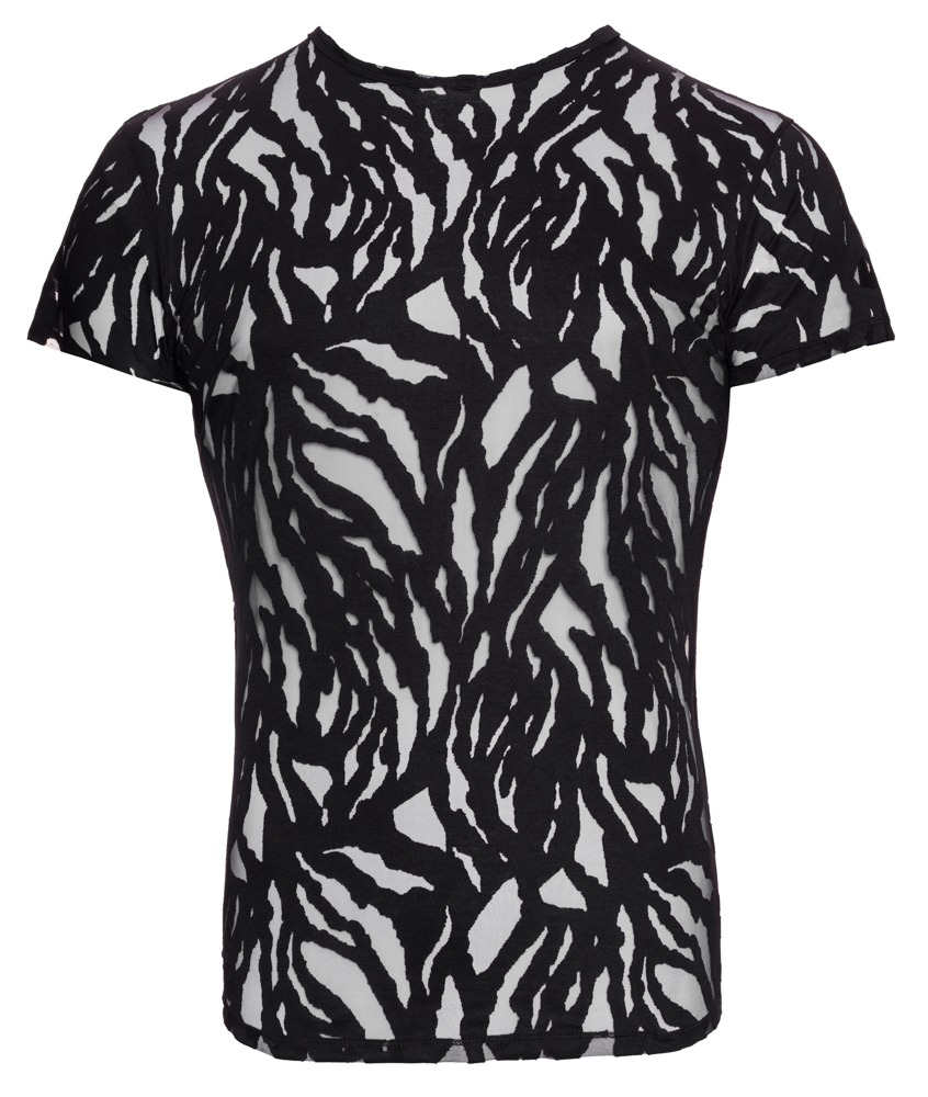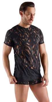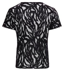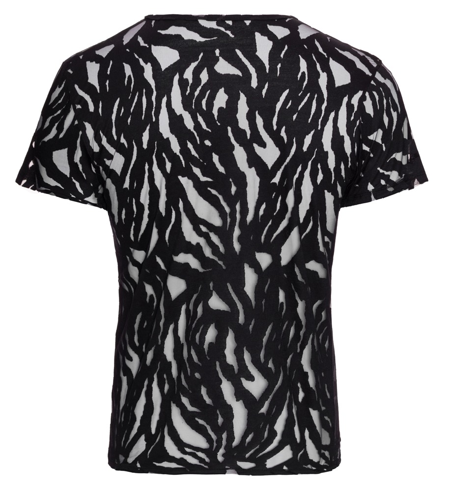 The emphasising shirt from Svenjoyment has short sleeves. It is black and has a bold burnout effect – it is excitingly transparent and stylishly opaque at the same time. It is also soft and stretchy, which means that it is very comfortable to wear.