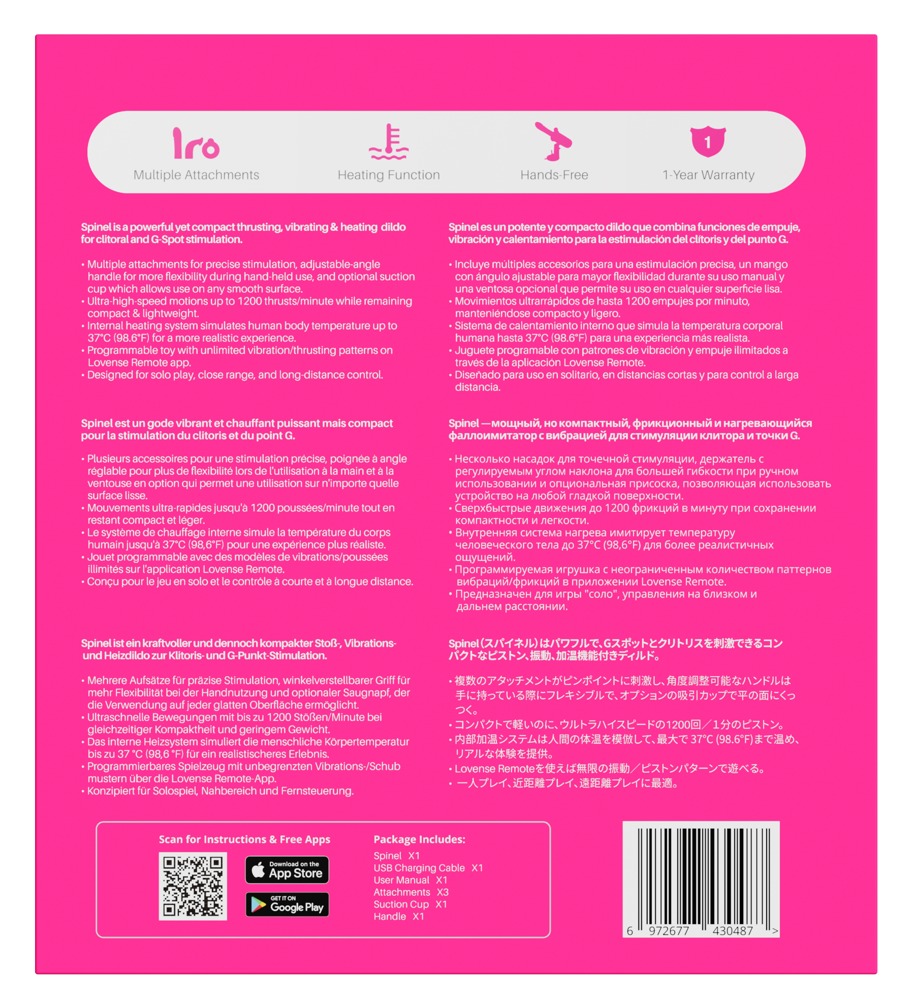 The lightweight, compact, app-controlled and portable dildo, Spinel from Lovense, has a thrust, vibrating and warming function. This powerful set can provide pleasure with its versatile accessories in a very intense, varied and comfortable way. The included straight dildo attachment, curved G-spot attachment and clitoral stimulator can be quickly attached to the base unit and they can be easily swapped as well. The same applies to the practical handle and adjustable suction cup. This means that the stylish Spinel is quickly ready for use whatever the mood or desire – for solo or couple's play, at home or on the go!