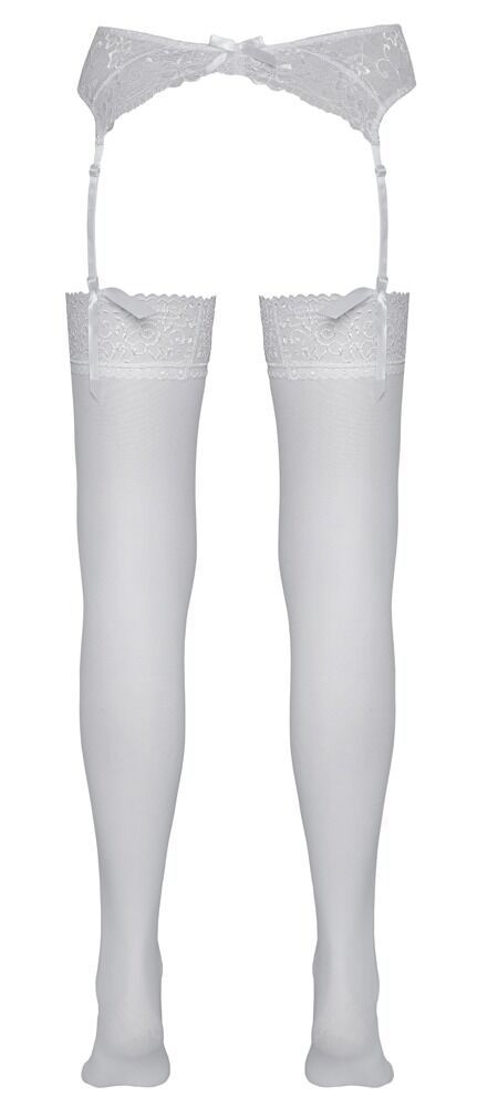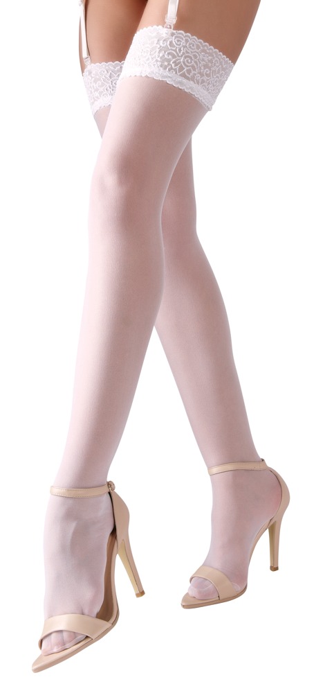 White stockings to make your legs look incredibly beautiful. With a 7 cm floral lace top. Pre-shaped. Oeko-Tex certified fabric. 95% polyamide, 5% spandex.