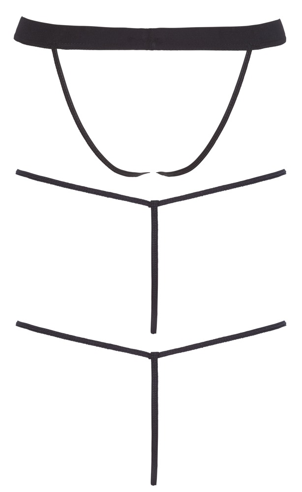It's always good to have these three strings in the underwear drawer. There is a mini string, mini G-string and a jock. All three strings are made out of stretchy, black material that is in a very shiny wet look. 90% polyester, 10% spandex, polyurethane coating.