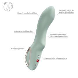 The pulsating thrust function in 8 different modes can be easily controlled at the push of a button – it can go from gentle massages to deep penetration. It is waterproof as well, which means that it can be used in the bath or the shower. The vibrator's ergonomic shape and the large tip make targeted and intense G-spot massages possible. The vibrator is made of velvety soft silicone, meaning that it is easy to insert and will slide in (almost on its own) during pulsating thrusting. Deep stimulation with maximum comfort – alone or with a partner!