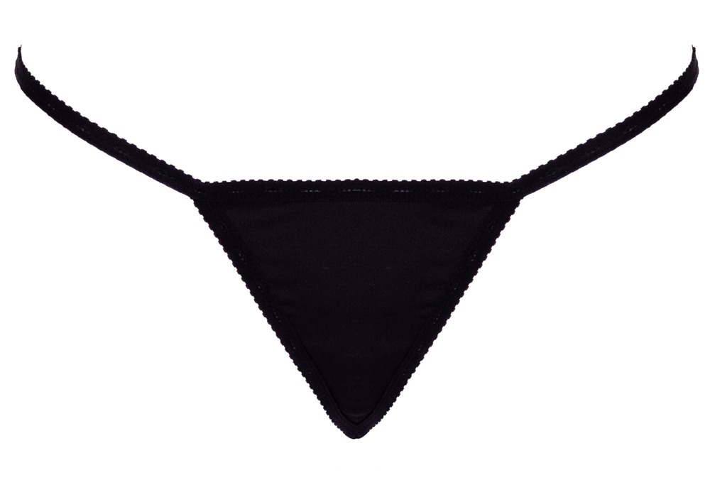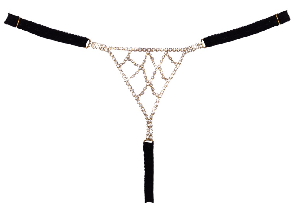 The luxurious black thong from Cottelli LINGERIE has a front part that is made out of soft, stretchy material and gold-coloured accessories at the back. There are also sparkly rhinestones in a triangle shape at the back of the thong. The waistband can be adjusted to fit.