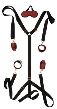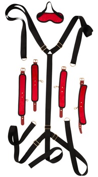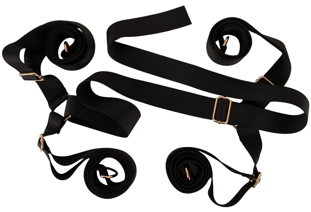 The sturdy, adjustable X-shaped strap is simply placed under the mattress. The stylish restraints are then hooked onto the rings at the end of the straps with their snap hooks. The soft, comfortable restraints for the hands and feet can be quickly put on and adjusted to fit with the buckle fasteners. The comfortable, opaque blindfold with a wide and stretchy head strap can be put on quickly and makes bondage play even more exciting and intense.