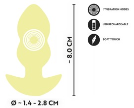 The Vibrating Mini Butt Plug Yellow from Cuties is the cheeky toy for anyone who wants to discover anal pleasure in a playful way. With its lightweight design and narrow tip, the compact silicone plug glides in easily and makes starting the fun extremely simple. The parts that are in different sizes and the grooved texture provide an exciting sensory experience. The 7 intense vibration modes bring thrilling variety and lots of pleasure to the party. Just press the button and enjoy the fun!