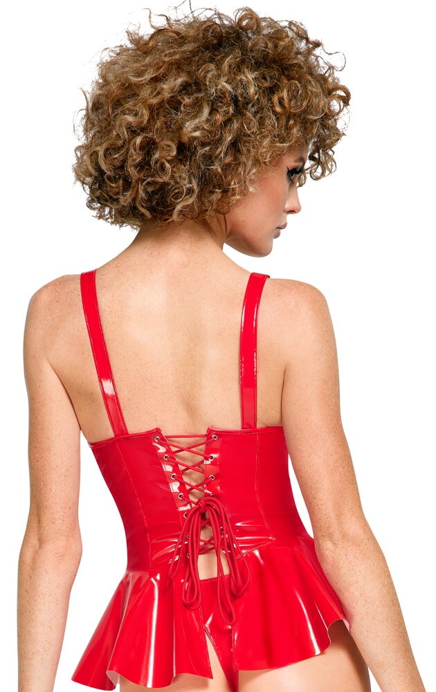 The vinyl set from Black Level has a longer peplum top and thong. The set is made out of shiny bright red material with silver-coloured accessories. The tapered top is low-cut in the cleavage area and has a metal zip at the front. There is adjustable lacing at the back of the top. The straps on the large rings can be adjusted with the decorative press studs. There is also a matching vinyl thong with a stretchy strap at either side for a perfect and comfortable fit.