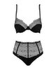 Schwarzes Dessous-Set Sharlotte von Obsessive mit Bügel-BH und High Waist String. Weiches Stretchmaterial mit elastischer Spitze in Mandala-Optik. Bügel-BH mit verstellbaren Trägern und verstellbarem Hakenverschluss im Rücken. Taillenhoch geschnittener String mit schwarzen figurschmeichelnden Silhouette-Streifen.