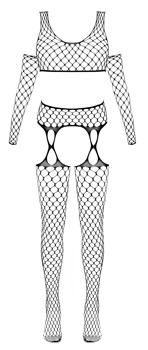- Schnitt & Material: 3-teiliges schwarzes Dessous-Set mit kurzem Top, Straps-Strumpfhose und Armstulpen (1 Paar) aus großmaschigem Netz. Straps-Strumpfhose im Schritt offen, Zehenpartie verstärkt. 94% Polyamid, 6% Elasthan.