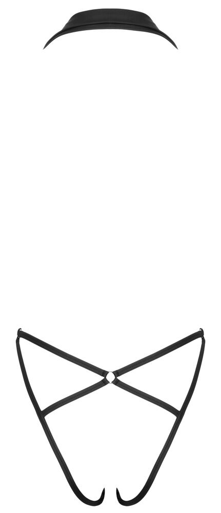 - Schnitt & Material: Body im edlen schwarzen Mattlook mit offener Front und freiem Rücken & Po. Neckholder mit stylischem Kragen. Kleine Reißverschluss über dem Venushügel. Über dem freien Po gekreuzte Stretchbänder mit silberfarbenem Ring. 90% Polyester, 10% Elasthan, Polyurethan-Beschichtung.