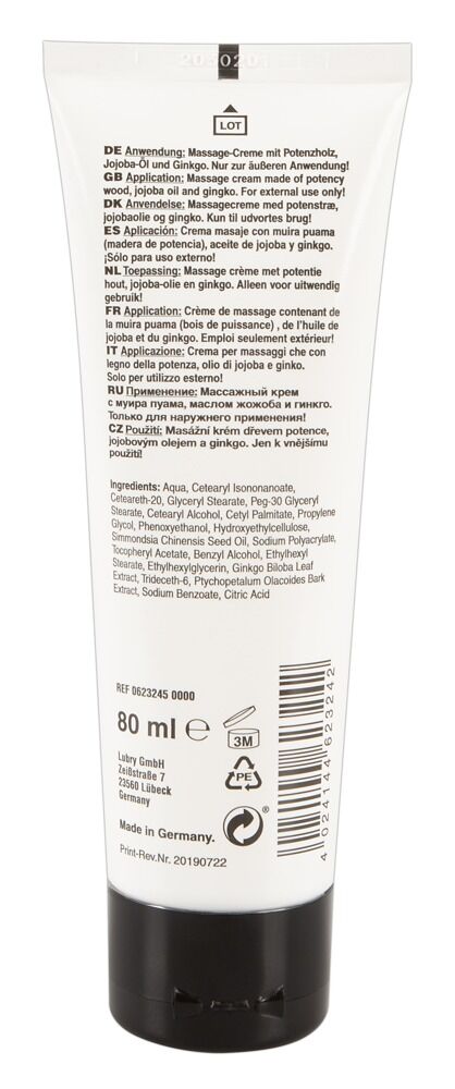 - Inhalt: 80 ml Pflegecreme zum Einmassieren in den Penis. Mit Potenzholz, Jojobaöl und Ginkgoextrakt.