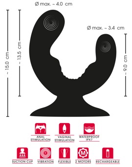 - Dynamisches Doppel: Verwöhnt zugleich vaginal & anal oder vaginal & klitoral oder anal & perineal.