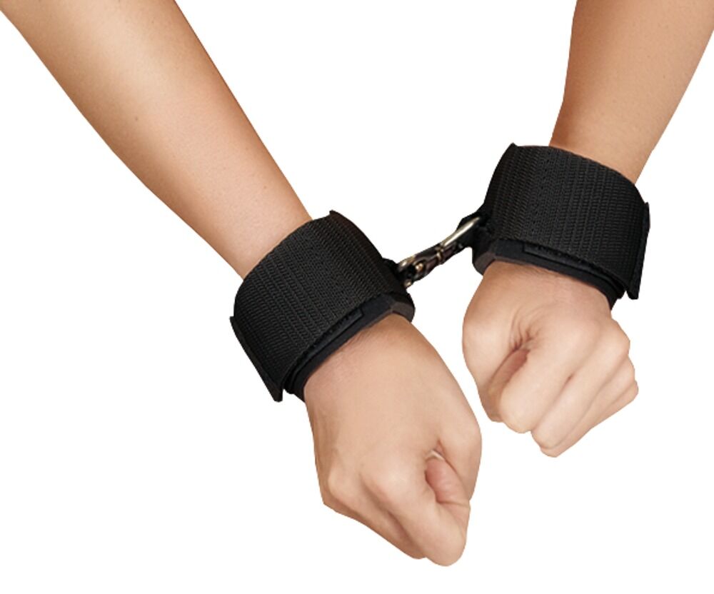 - Handfesseln: Mit metallenem Drehring in der Mitte und Klettverschluss.