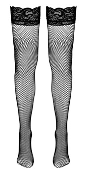 - Schnitt & Material: Halterlose, schwarze Netzstrümpfe mit Spitzenabschluss; innen Silikonverstärkung für rutschfesten Sitz und optimalen Halt. 90% Polyamid, 10% Elasthan.