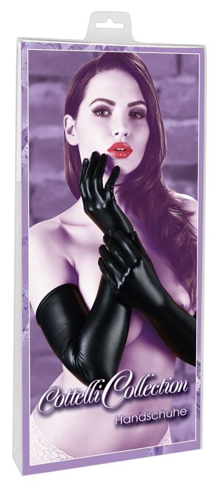 Extra lange Handschuhe im glänzend schwarzen Wetlook. Als Edel-Look zu Corsage und Co., aber auch als einziges Kleidungsstück am Körper ein garantierter Hingucker mit anregender Wirkung…